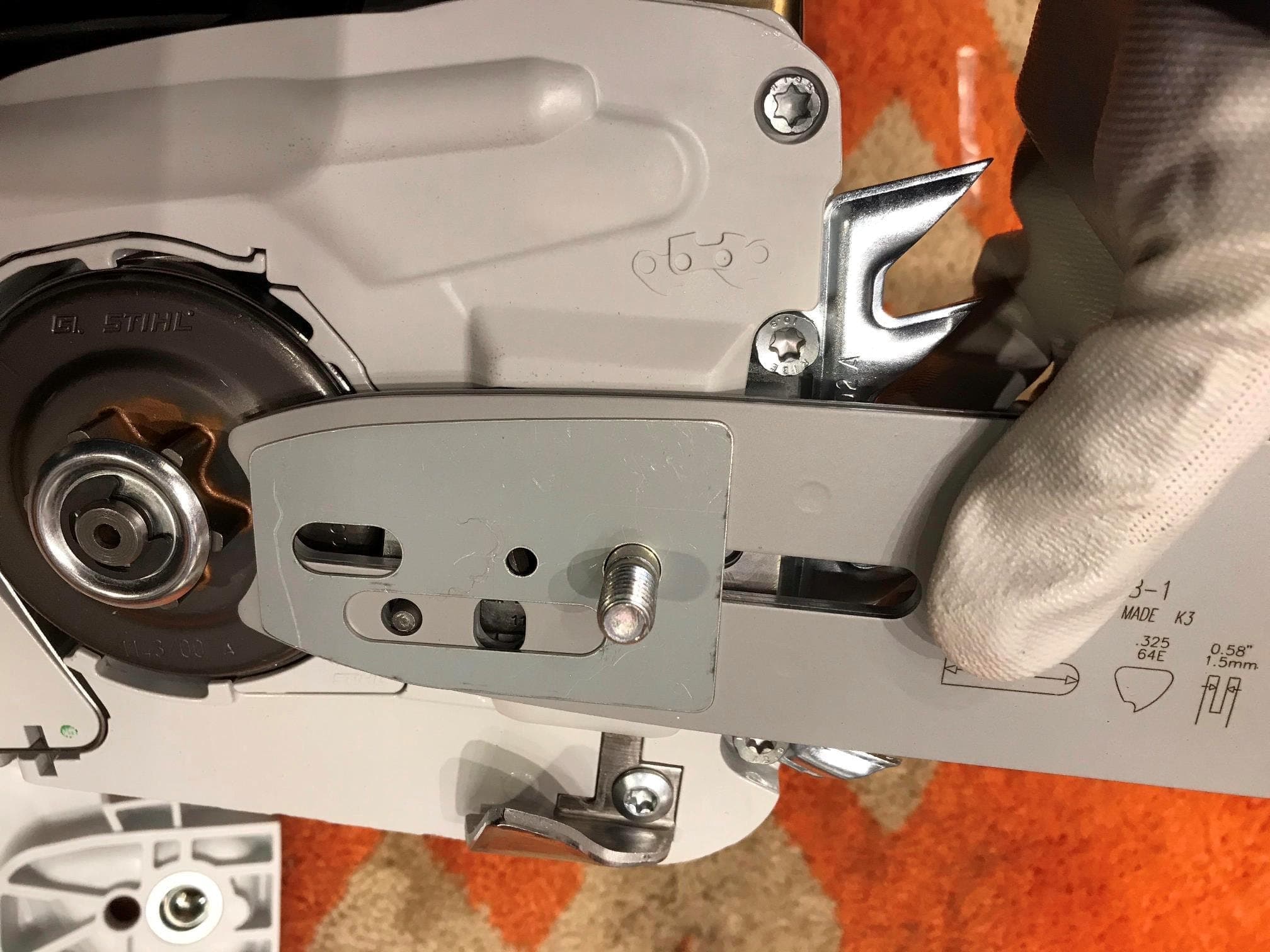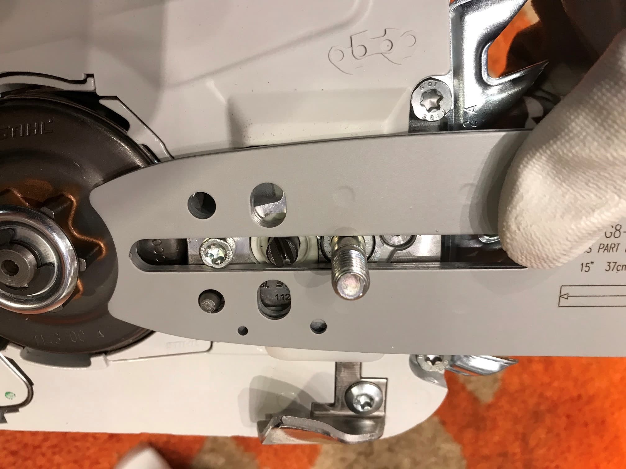 STIHLに使用する際 チェンテンショナーのネジの穴をご自身で拡大していただく必要があります。